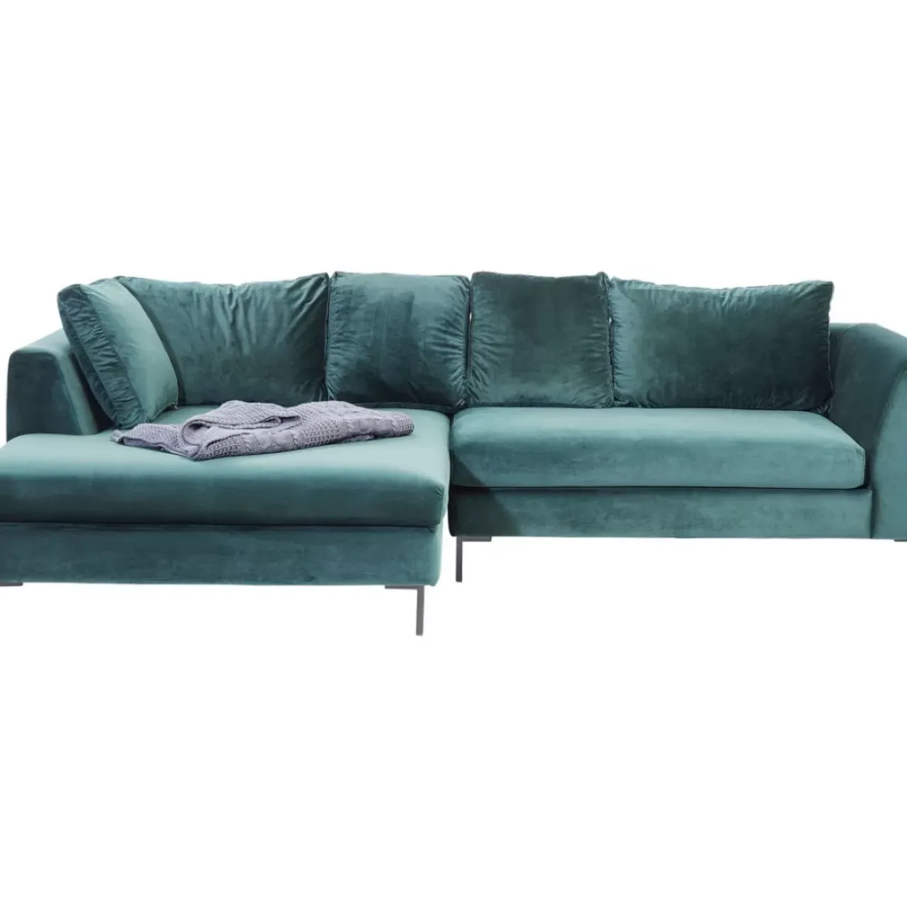 - Modernes Eck-Sofa Mit Aktuellem Samtbezug In Der Farbe Petrol Und Funf Legeren Wurfkissen. Besonders Bequem: Die Breite Recamiere