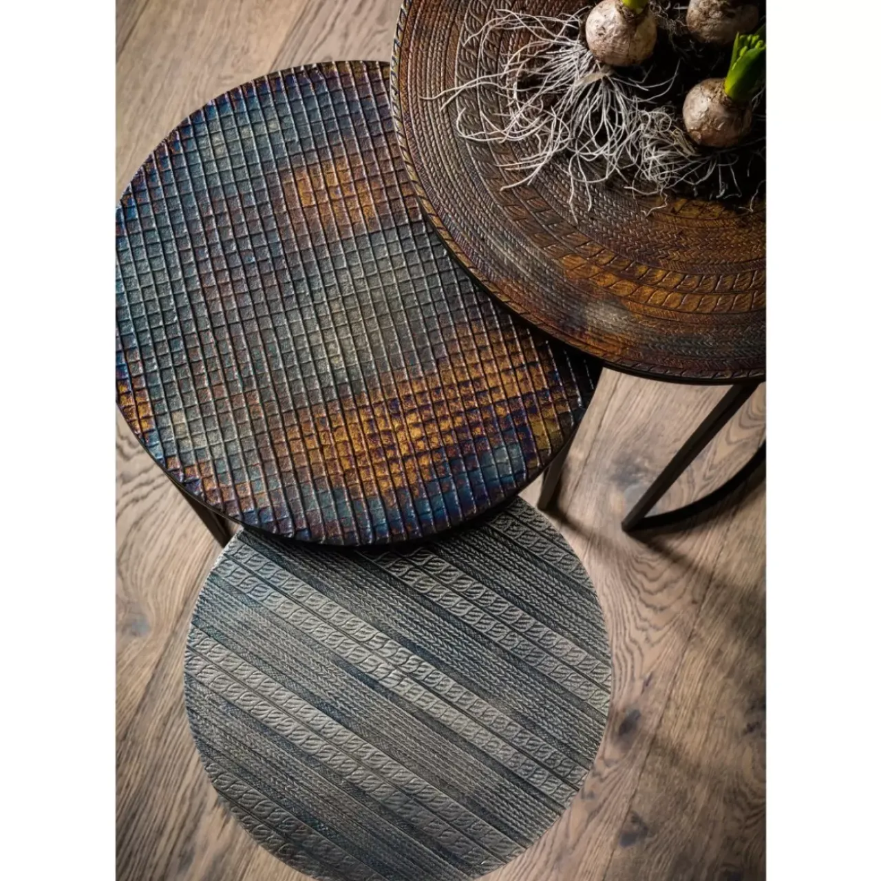 Set Von Drei Runden Beistelltischen Aus Metall In Unterschiedlichen Hohen Jede Tischplatte Ziert Ein Anderes,Hubsch Stru…