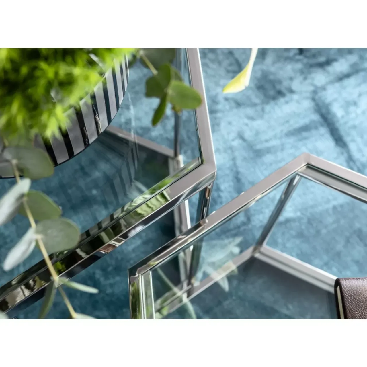 - Modern Glam-Sechseckiger Glas-Couchtisch Mit Einem Gestell Aus Silberfarbenem Stahl