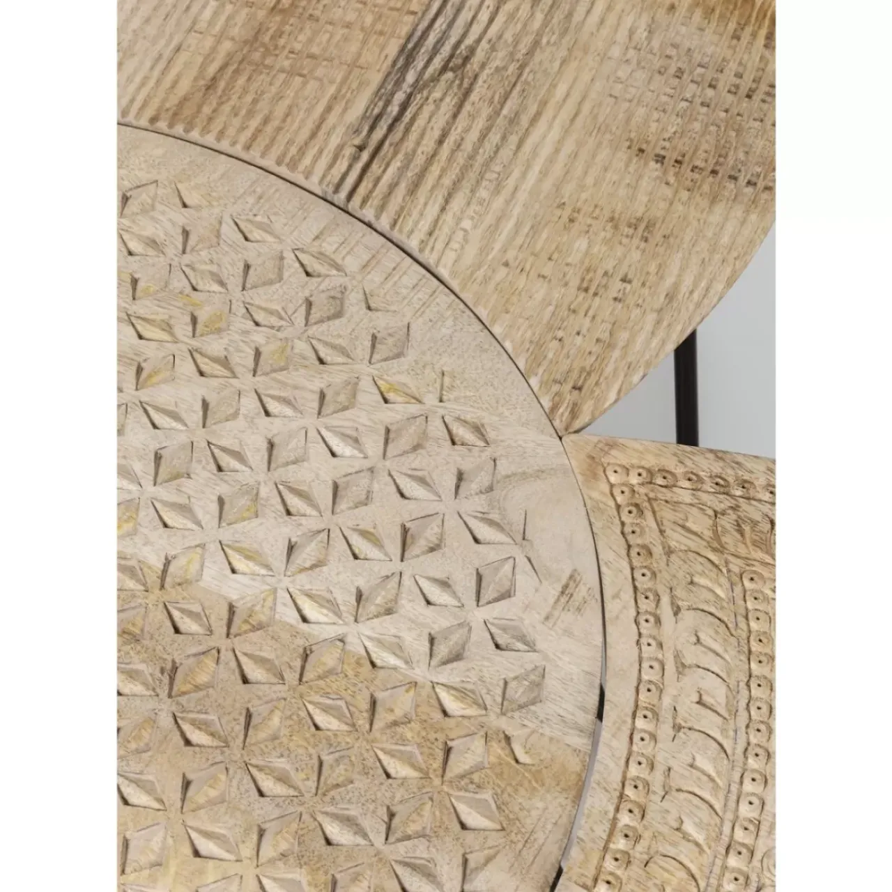- Handgefertigter Couchtisch Im 4-Er-Set Aus Mango-Massivholz Mit Dekorativen Schnitzereien Und Schwarzen Stahlbeinen