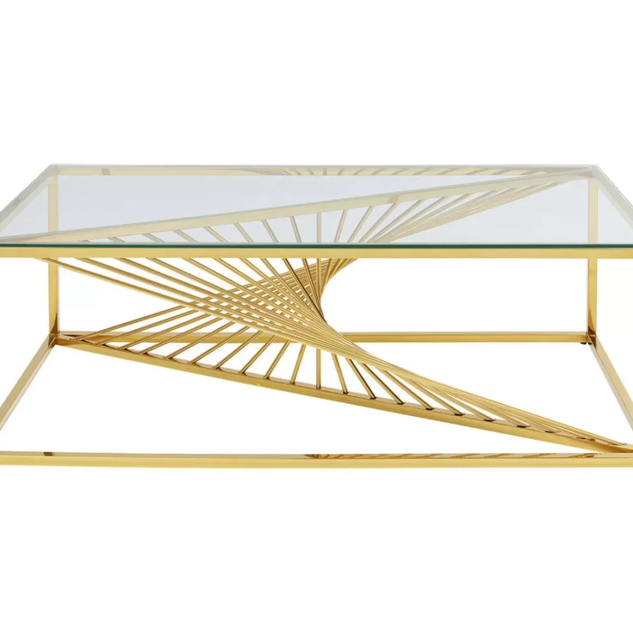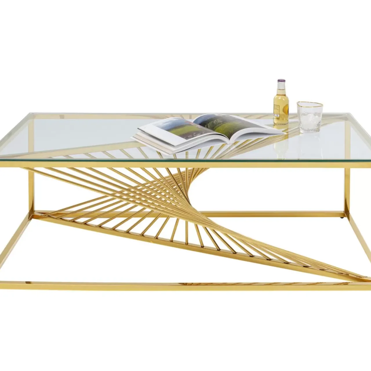 - Reprasentativer,Gold Glanzender Couchtisch Aus Poliertem Edelstahl Mit Exklusivem Gestell Und Einer Glasplatte